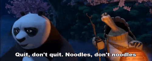 In the very next scene, we find Po coping with this situation by eating some sacred peaches and contemplating leaving the Jade Palace to return to his life as a noodle vendor. Like some of us, Po turns to food when he is upset. And like some of us, Po deflects when confronted about it. It is in this scene that we get our quote that is the basis of this whole post. As Po eats, he is approached by Master Oogway, the wise leader of the Jade Palace. After Po shares his troubles, Master Oogway responds by saying: “Quit; don’t quit. Noodles; don’t noodles. You are too concerned with what was and what will be. There is a saying: yesterday is history, tomorrow is a mystery, but today is a gift. That is why it’s called the present.”
